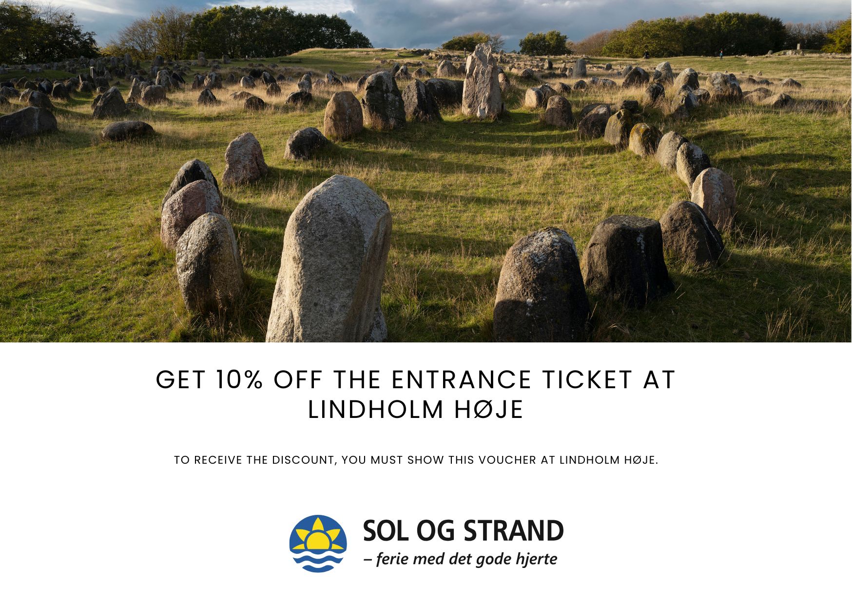 Als vakantiegast bij Sol og Strand ontvang je 10% korting op de entree tot het Vikingmuseum Lindholm Høje. Neem deze voucher mee en toon deze bij de ingang om de korting te verkrijgen.